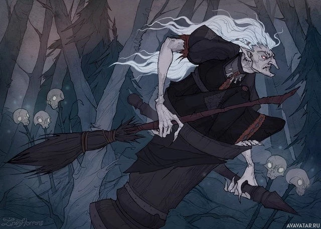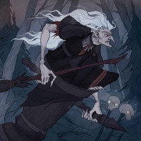 a dark robe with elements that resemble bat wings. The background suggests a nighttime setting in a forest or wooded area, with illuminated skulls floating around her, adding to