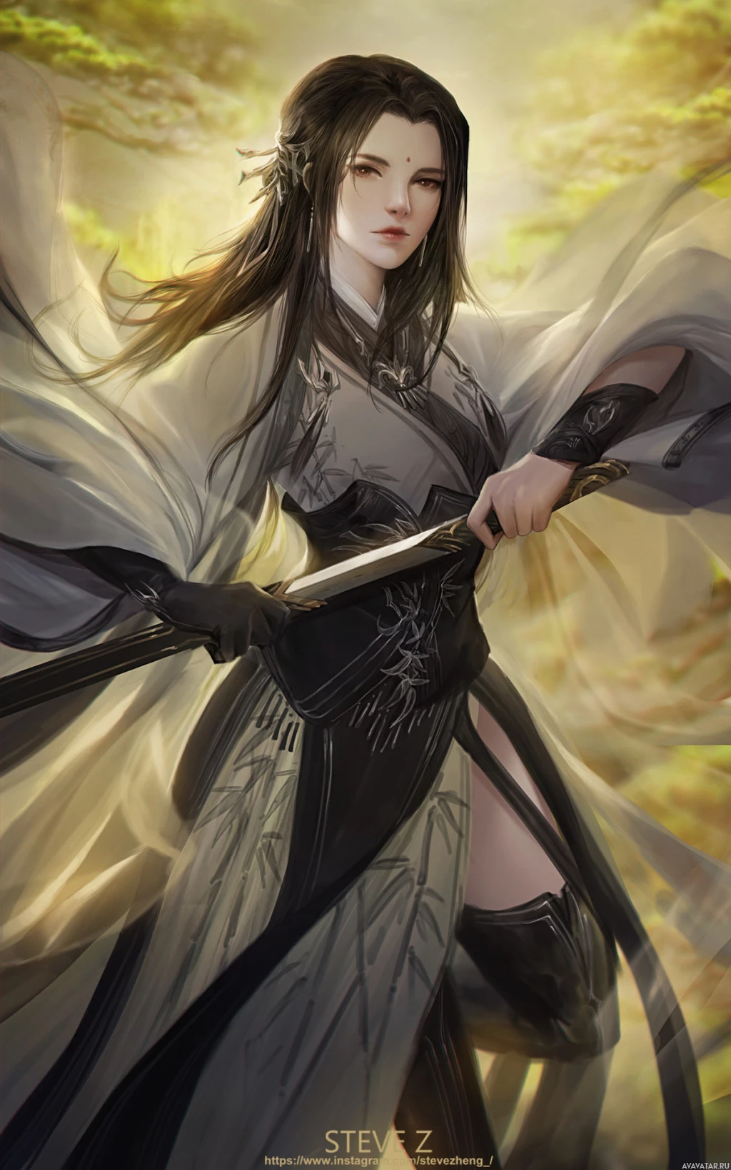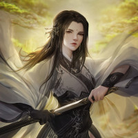 На картинке изображен иллюстрированный персонаж женщины с длинными темными волосами, одетый в традиционное платье в китайском стиле с замысловатой детализацией. Она держит меч и имеет безмятежное выражение лица. Фон предполагает фантастическую или мифическую обстановку с мягким освещением и тем, что кажется лесом или естественной средой.