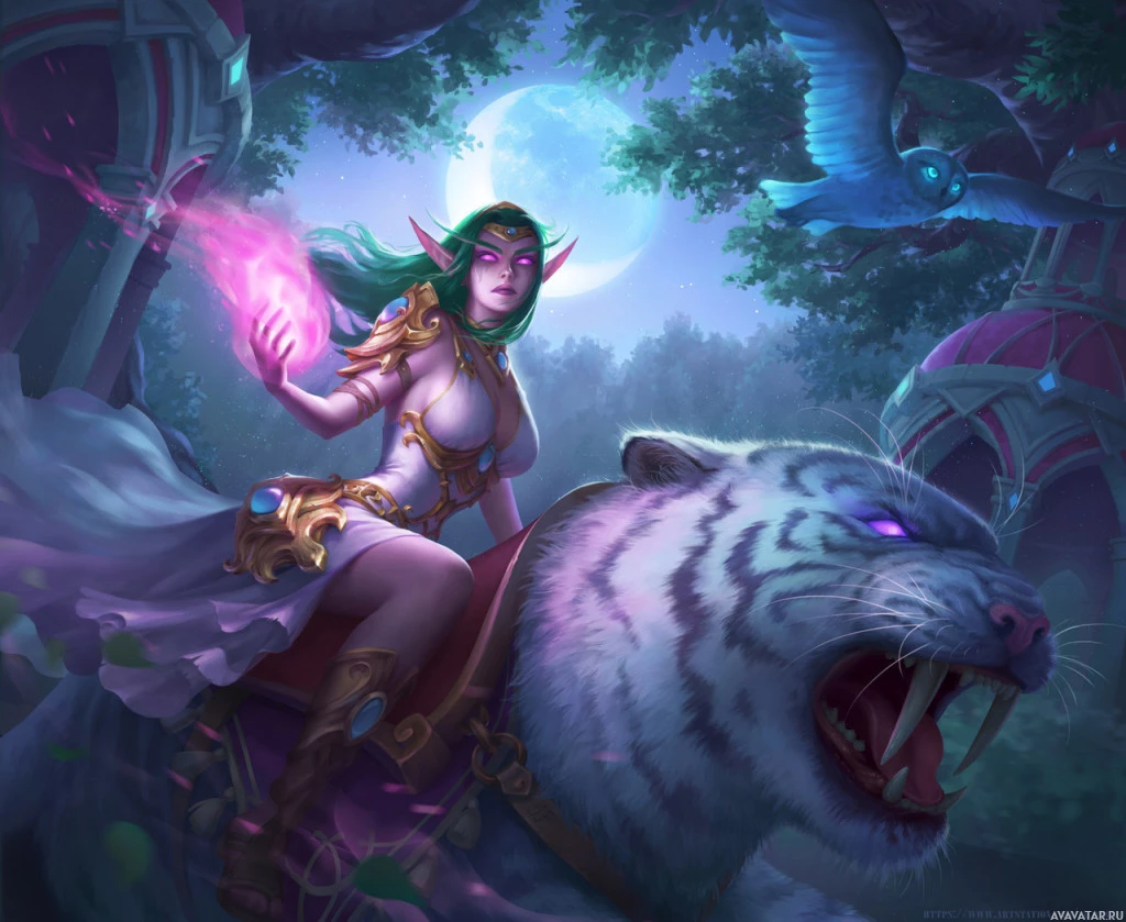 a fantasy scene with an elf woman riding on the back of a tiger. She appears to be casting a spell or using some sort of magical ability, as indicated by the glowing
