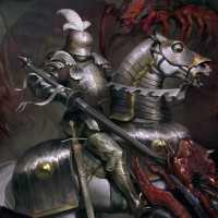 fantastical creatures that seem to be monsters or demons, adding a dark and ominous atmosphere to the scene.