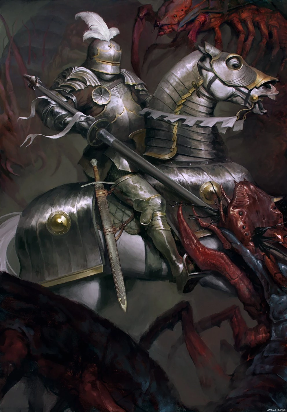 ancient armor, suggesting a medieval or fantasy setting. The rider holds a lance and wears a helmet with what appears to be feathers attached, which could signify status or rank. In the background, there are various