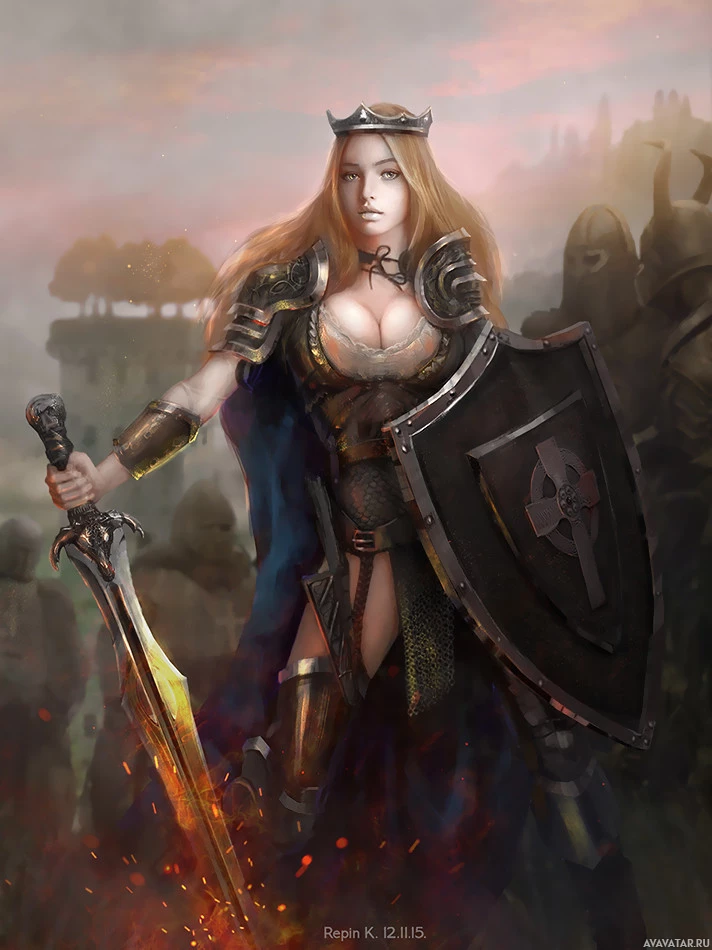 blonde hair and is wearing armor that includes a crown, suggesting she may be royalty or a leader within her context. In her hands, she holds a sword with a shield on it, which further emphasizes her combat-