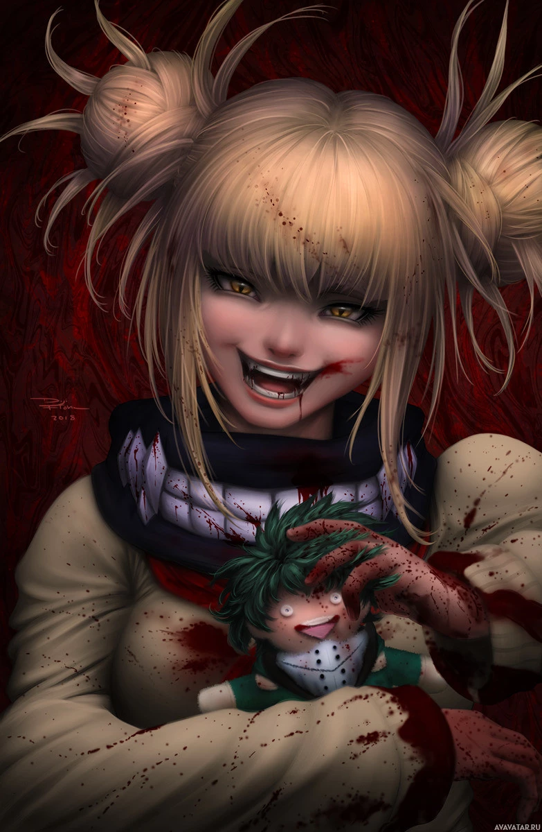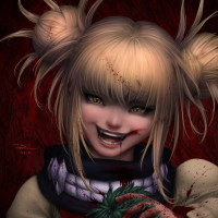 an animated character, a blonde girl with her hair styled in pigtails. She is smiling and appears to be in a bloody or violent situation given