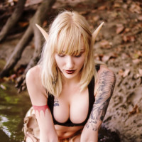 pointed ears and her eyes are closed. Her appearance suggests that she could be portraying