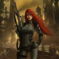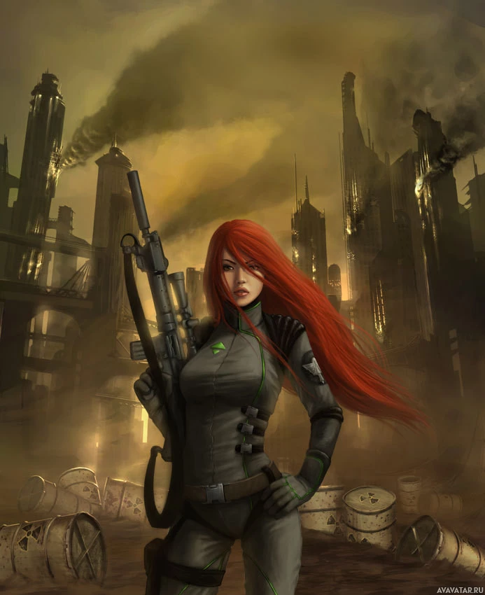 На картинке изображена женщина с рыжими волосами, носящая тактическое снаряжение и держащая оружие. Она находится в городской или промышленной обстановке, которая напоминает постапокалиптический городской пейзаж. Вокруг нее ветхие здания, а небо наполнено тёмными облаками или дымом, предполагая конфликт или опасность. Выражение и позиция персонажа передают чувство решимости и готовности к действию.