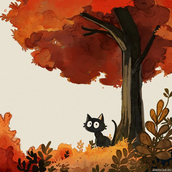 На картине изображен кот, сидящий перед осенним деревом. Сцена изображает осенний сезон с листьями, разбросанными по земле вокруг дерева и кошки. У кошки большие глаза, характерные для кошек, и она удобно сидит среди листвы.