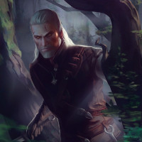 signature attire which includes a silver sword strapped to his back, and he appears to be in a wooded or forested area, possibly in a scene from one of the games or stories. The character is known for his role as a monster hunter and witcher in