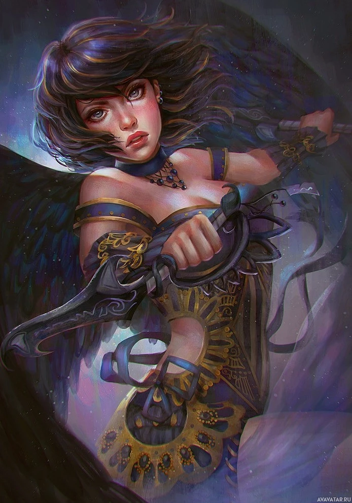 a figure from mythology, as suggested by her wings and armor. The character has long
