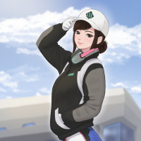 the video game "Overwatch." She is shown with her hand raised in a wave or greeting gesture, and she is dressed in a sports-themed outfit that includes a cap, a jacket,
