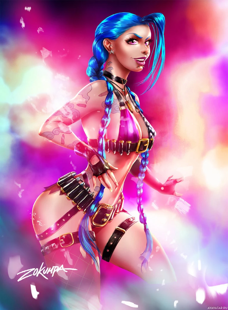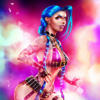 a female character, who appears to be inspired by Jinx from the game "League of Legends." She has distinctive
