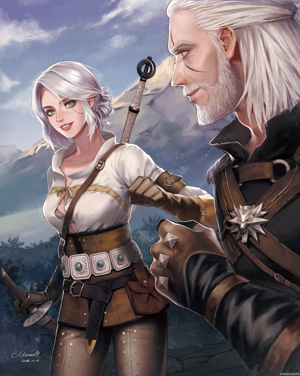 a female character with white hair and armor holding a sword. This character's design resembles Ciri, also known as Cirilla Fiona Elen Riannon, who is