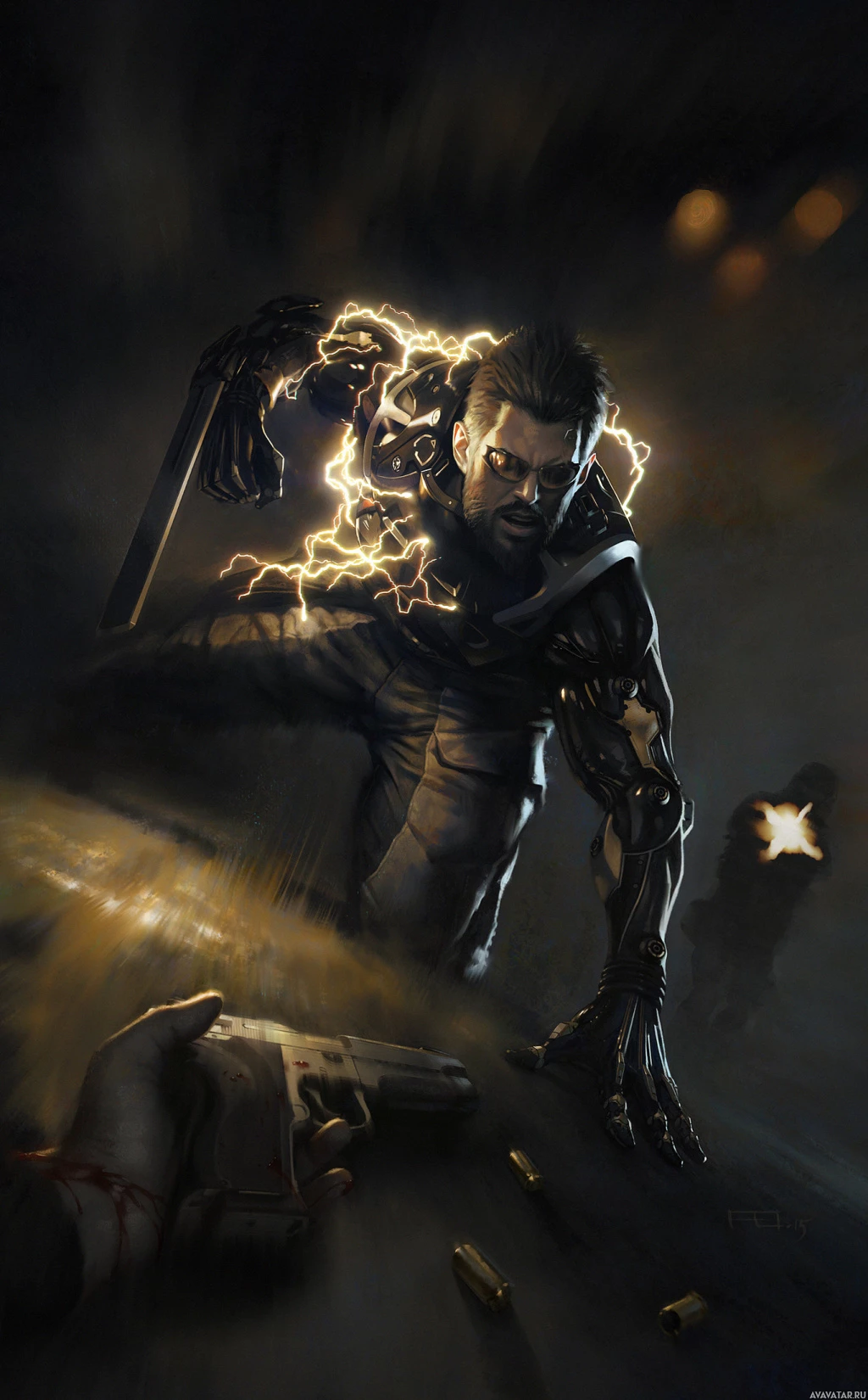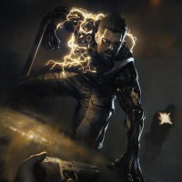 cybernetic enhancements and the electric discharge visible around him. He's holding what looks like a weapon or tool, and there is