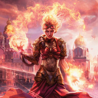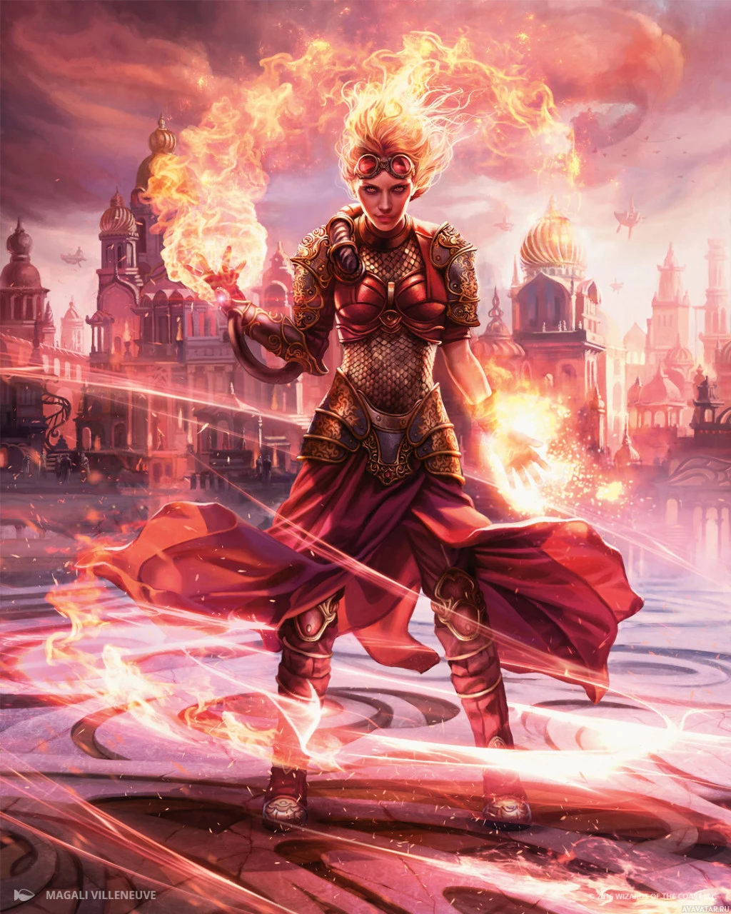 an elaborate hairstyle with braids and possibly wings, which contributes to the magical or fantastical atmosphere. In her right hand, she holds a staff that seems to emanate flames. The background shows a cityscape with buildings reminiscent of a medieval or fantasy architecture, enhancing