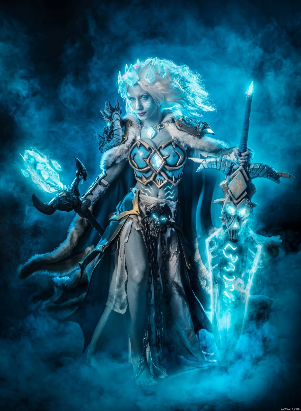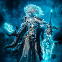 На картинке изображен фэнтезийный персонаж, одетый в доспехи и держащий посох. Этот персонаж, вероятно, из вселенной Warcraft, учитывая, что он соответствует описанию, предоставленному как «фантазия» и «Warcraft». Использование синего освещения создает потустороннюю и мистическую атмосферу вокруг нее.