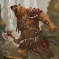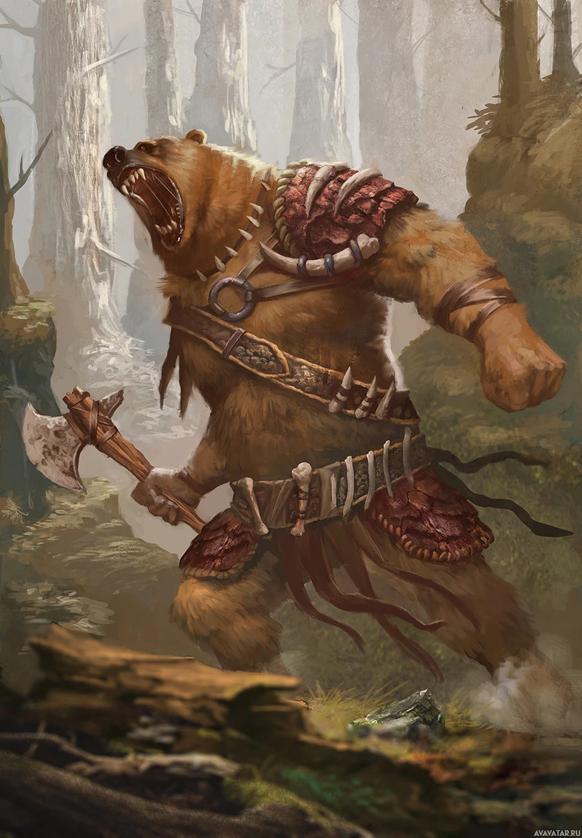 a fantasy scene featuring an anthropomorphic bear character. This creature is wearing what appears to be armor and holding an axe, suggesting that it may be part of some sort of battle or adventure scenario within this