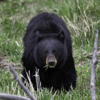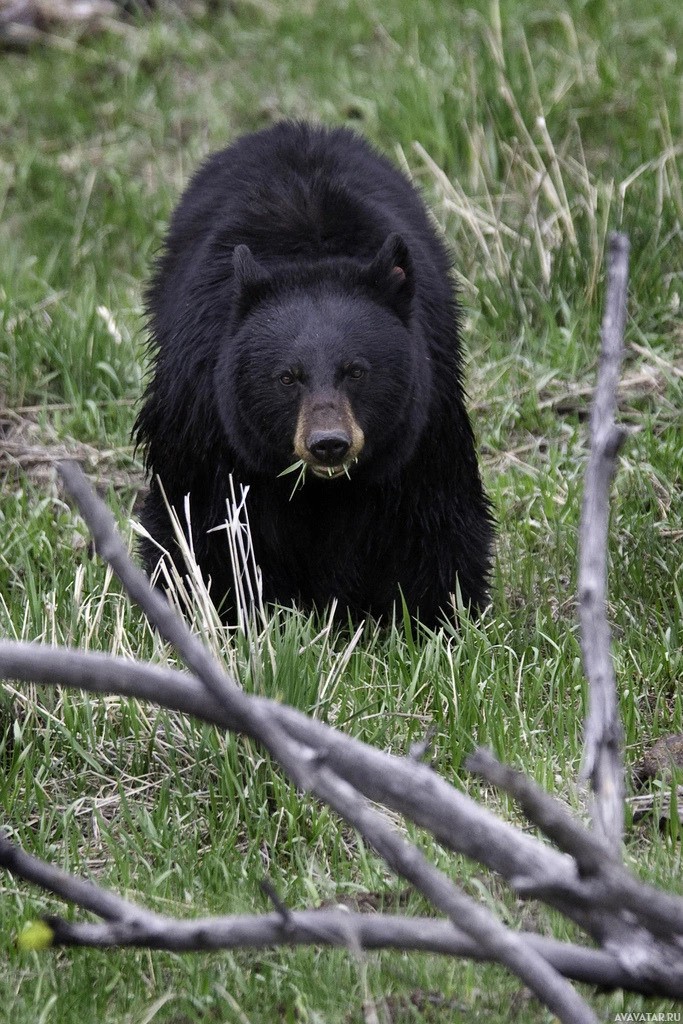 На картине изображен большой черный медведь, стоящий в траве. По-видимому, он находится в естественной среде обитания, возможно, в поле или на лугу в дневное время под ясным небом. Медведь смотрит прямо в камеру, создавая впечатление бдительности и осознания своего окружения.
