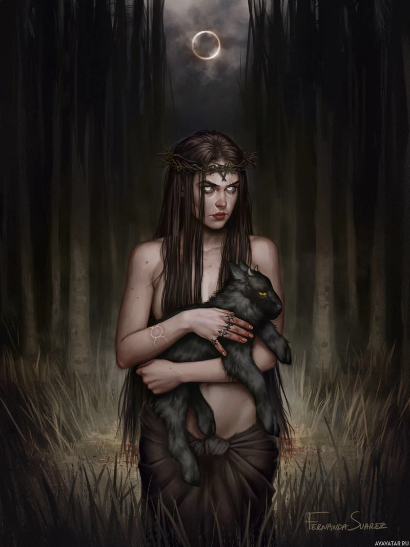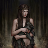 a small animal, which could be a cat or a fox, close to her chest. They are surrounded by a forest or woodland environment with