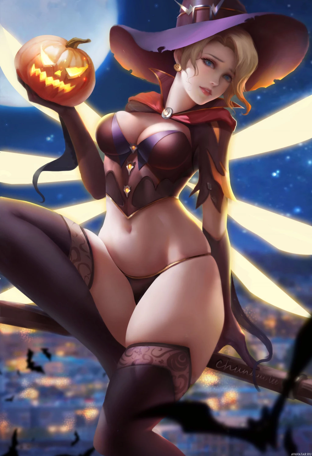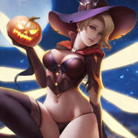a pointy hat and holding what appears to be a jack-o'-lantern in her hand. The character's wings are visible on either side of her back, suggesting that she might have some form of magical or mythical ability within the context of the game she is from. This costume is associated with