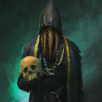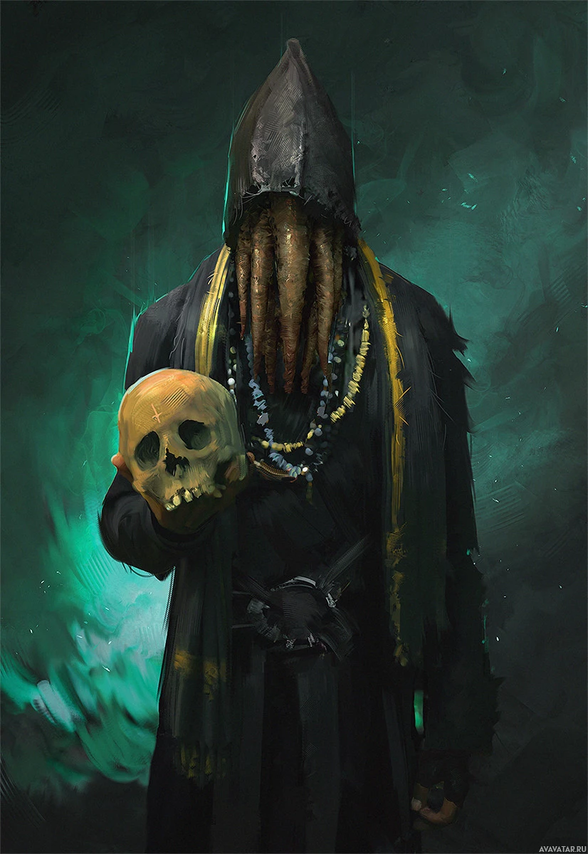 a hooded cloak, giving off an ominous presence. In one hand, the figure holds a skull, which is commonly associated with death or danger in