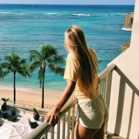 На снимке изображена женщина, стоящая на балконе с видом на океан. Она имеет длинные светлые волосы и носит повседневную одежду, подходящую для теплого климата, что говорит о том, что она может быть в тропическом месте. На заднем плане видны несколько пальм, что добавляет пляжной атмосферы. Океан кажется спокойным, что указывает на справедливые погодные условия.