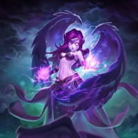 На картинке изображен фантастический персонаж, который, кажется, из игры «Лига легенд». Она изображена с фиолетовыми волосами и имеет фантастический внешний вид, возможно, представляющий собой элементальное или магическое существо, которому даны ее крылья и энергия, которую она, кажется, контролирует. Ее выражение и поза предполагают уверенность и силу. Фон намекает на мистическую или темную атмосферу, что согласуется с фэнтезийной темой «Лиги легенд»