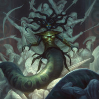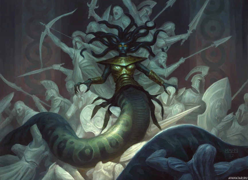 a fantasy scene featuring a creature that resembles Medusa, the mythological Gorgon from Greek and Roman mythology. The creature is seated on a throne-like structure, with its