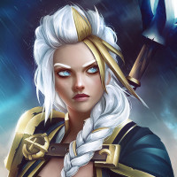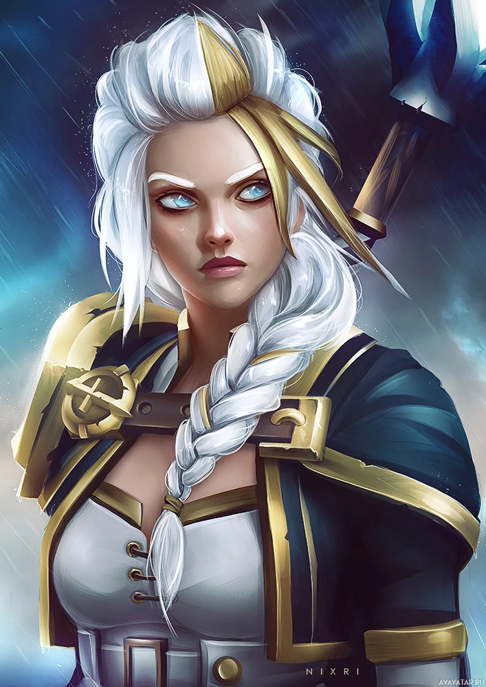 silver hair styled in braids or twists, wearing a white and gold armor with a cape that has an emblem resembling a lightning bolt. Jaina Proudmoore is a human