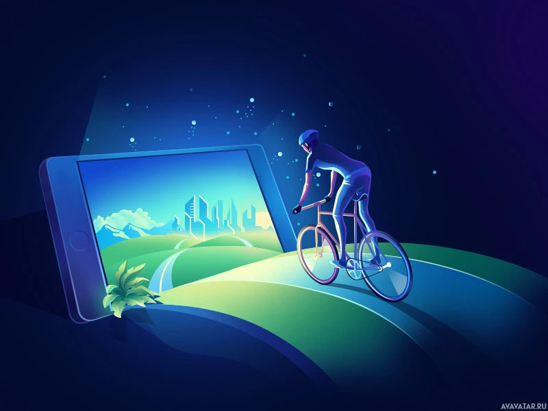 На картинке изображен человек, едущий на велосипеде сзади, с открытым планшетом или телефоном, отображающим картину живописного пейзажа. Сцена, вероятно, изображает использование технологий во время тренировки, таких как прослушивание музыки или просмотр видео во время тренировки или неторопливая поездка на велосипеде.