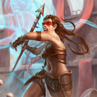 red hair and is wearing a fantasy-style outfit that resembles armor, suggesting she could be a warrior or a fighter. In her hand, she holds what looks like a lance or staff, which she seems to be using as a weapon. The setting appears to be