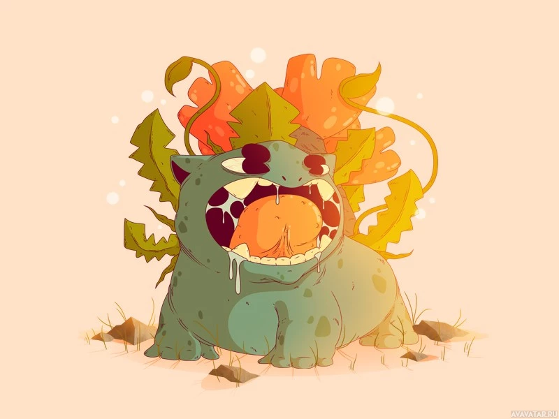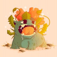 The image depicts a cartoon-style illustration of Bulbasaur, a character from the Pokémon franchise. Bulbasaur is shown sitting on grass with plants sprouting from its back. It appears to be in pain or distress, as indicated by the expression and the way it's holding its head. The art style gives it a stylized, animated look that is reminiscent of the Pokémon