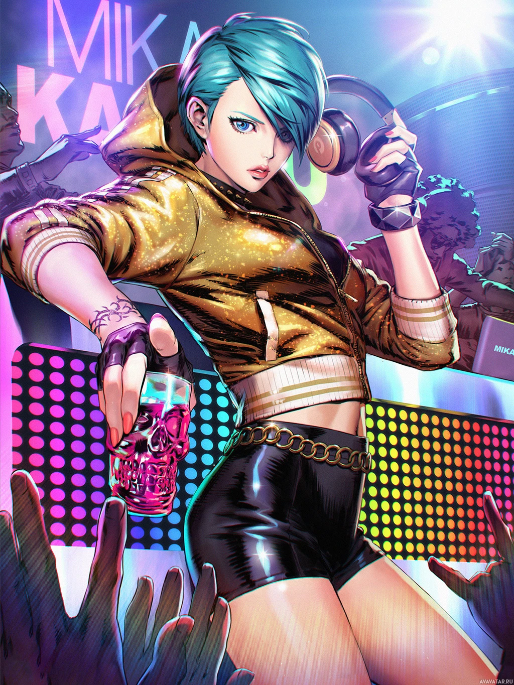 an animated character, a girl with blue hair wearing headphones. She is dressed in