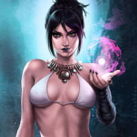 dark hair and an intense expression, holding out her hand as if casting a spell. She's wearing armor and appears to be set in a fantasy setting with magical elements around her, such as swirling