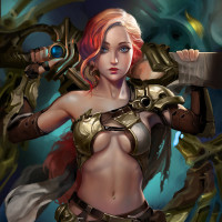 a female character with red hair. She is wearing a fantasy-style armor and appears to be holding some