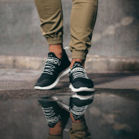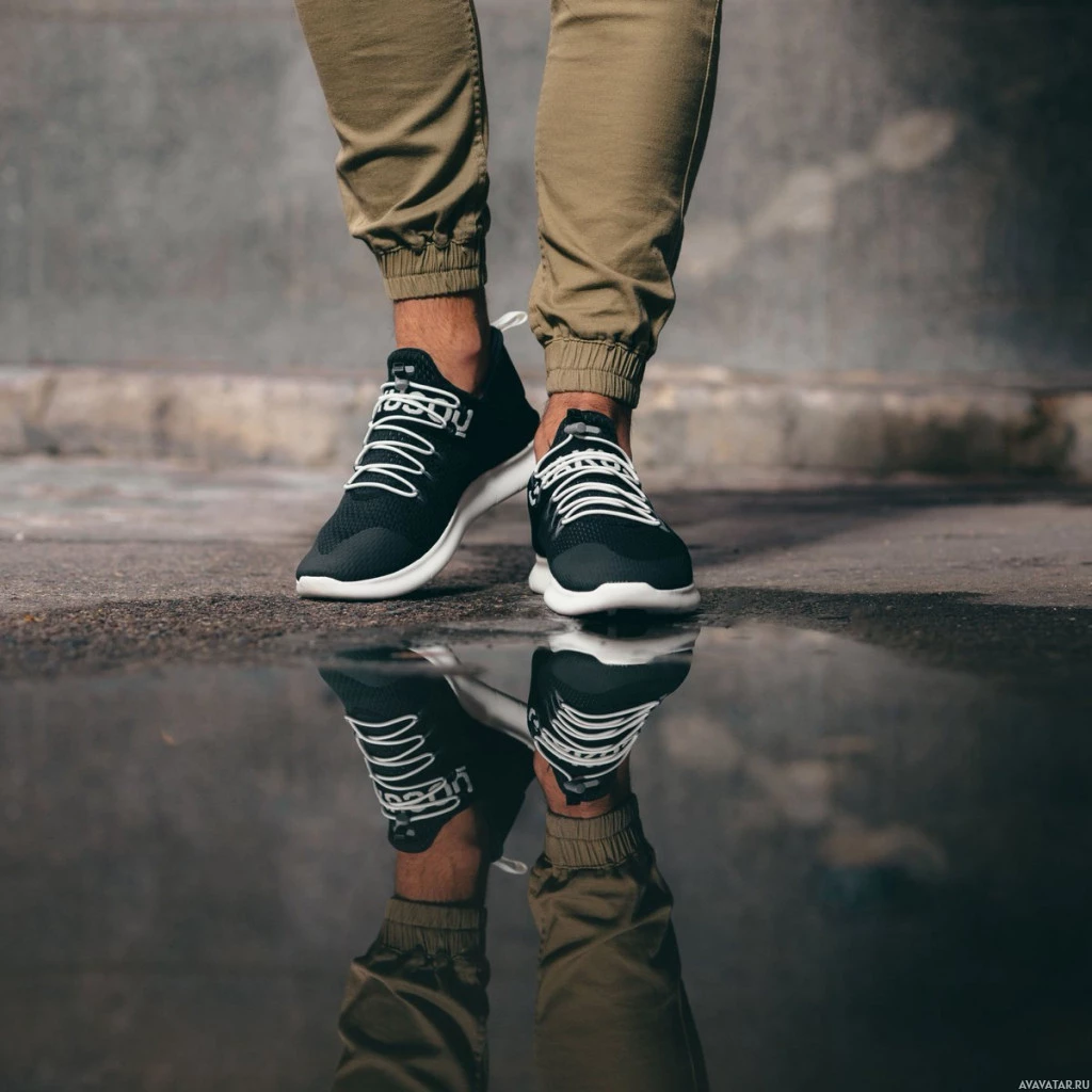 a wet surface. The person wearing these shoes is standing, and their lower legs are visible from just above the ankles down to where they meet the shoes.