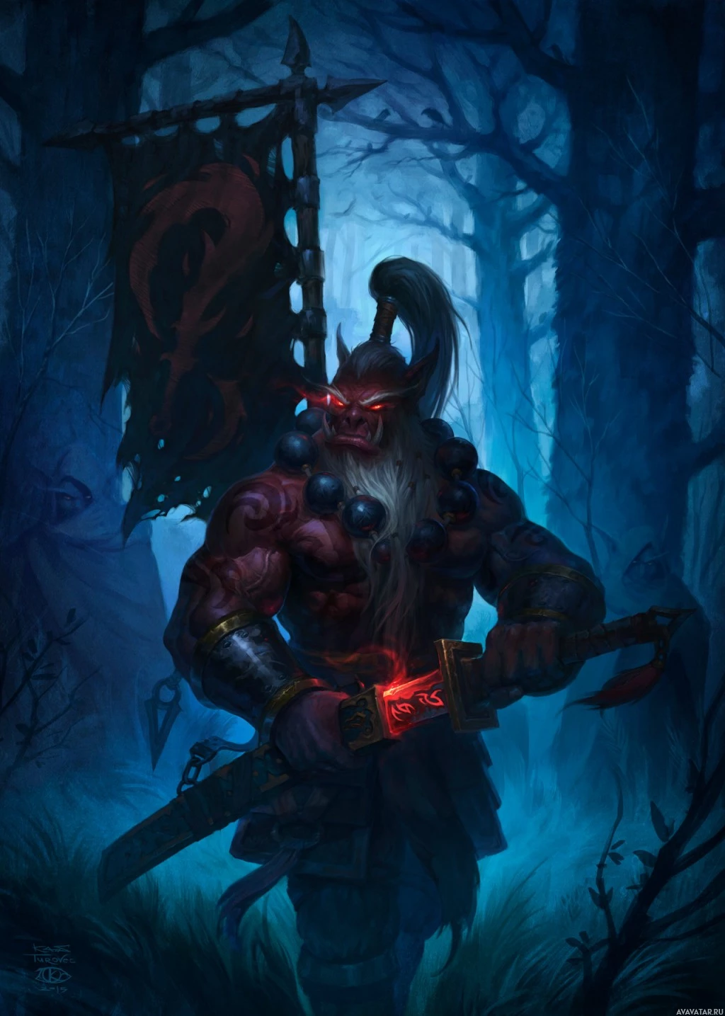 The image shows an artistic depiction of a character that appears to be inspired by the Warcraft