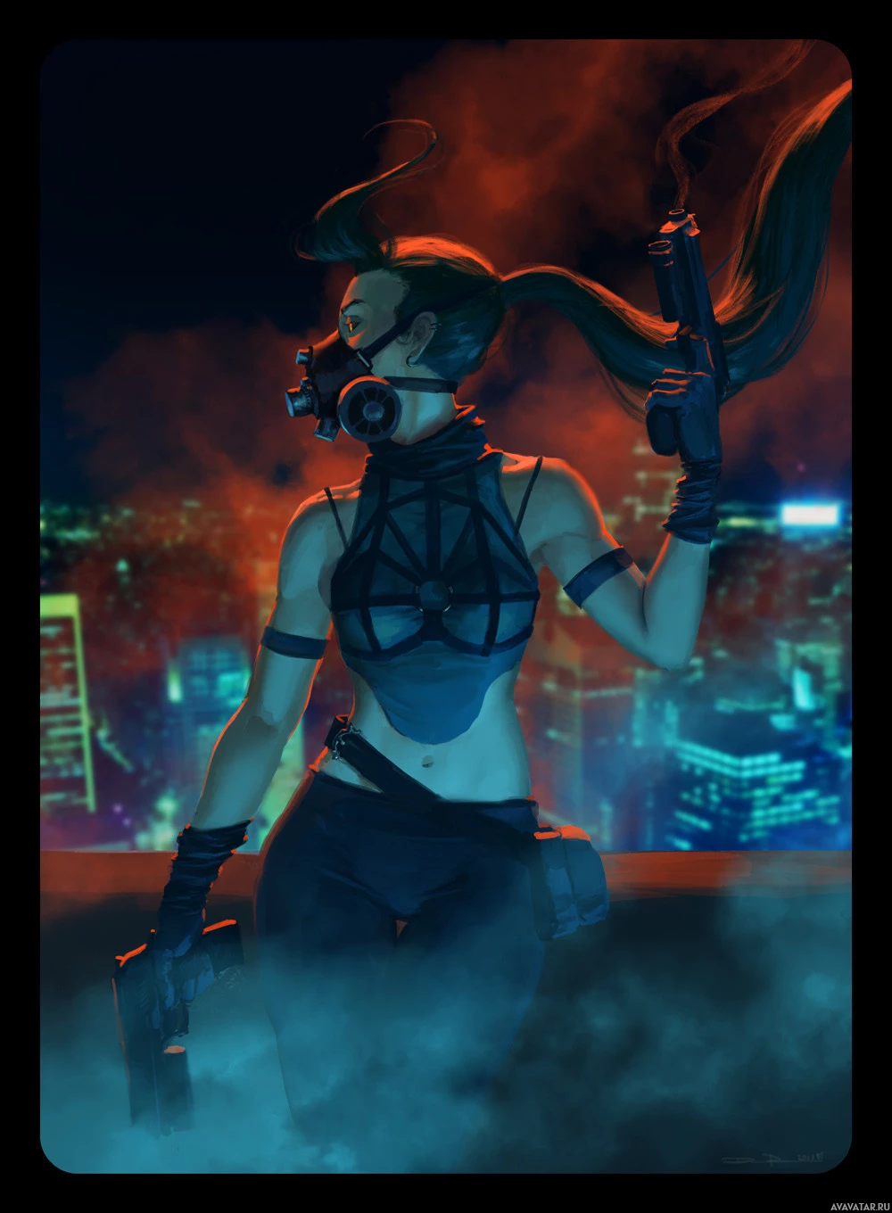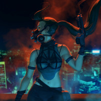 a glowing cityscape, which suggests a futuristic or cyberpunk theme. The character also has