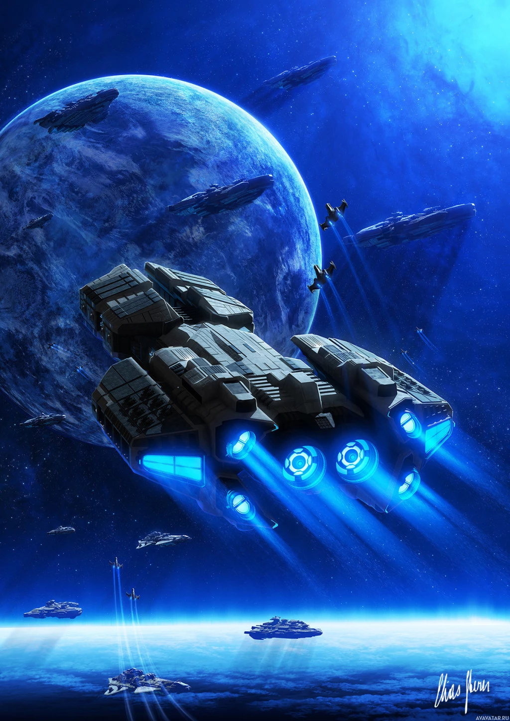 a science fiction scene with a spacecraft in the foreground and a planet in the background. It appears to be a digital artwork or illustration, capturing the essence of