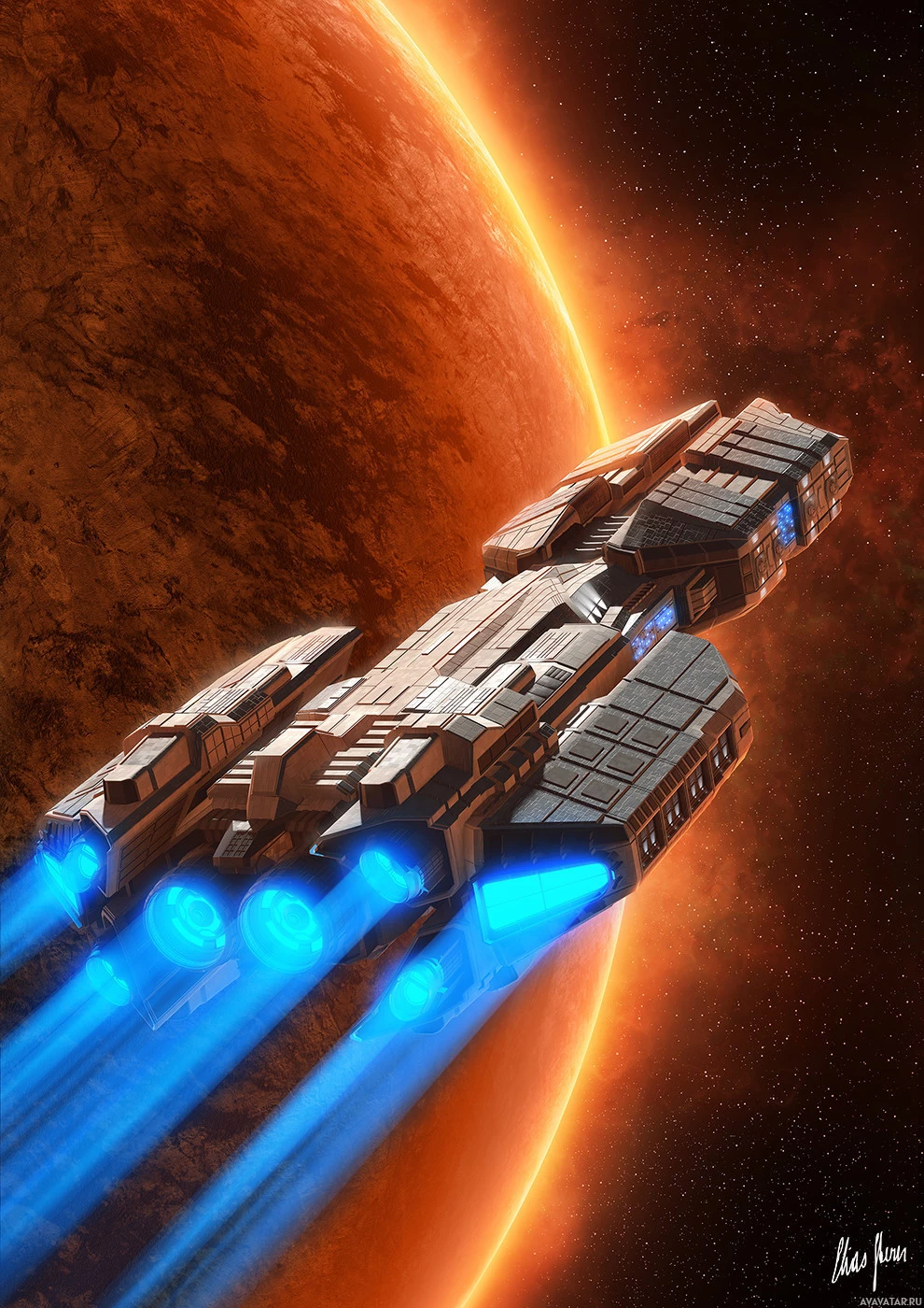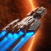 На картинке изображен научно-фантастический космический корабль, летящий в космосе. Это скорее иллюстрация, чем фотография, поскольку она демонстрирует элементы научной фантастики, такие как дизайн корабля и окружающая среда. Фон предполагает небесное тело с яркой звездой или солнцем на небе.