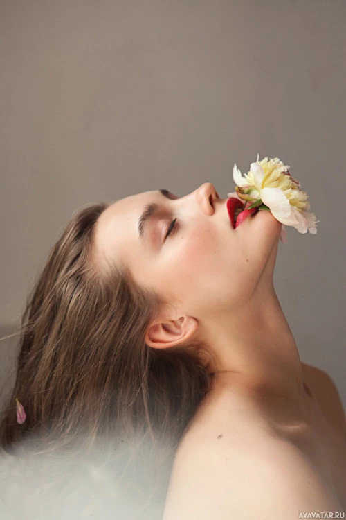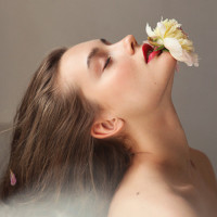 The image features a woman with her eyes closed, leaning down towards a flower. Her hair appears to be cascading gently around her shoulders. She seems to be enjoying the scent of the flower, and there is