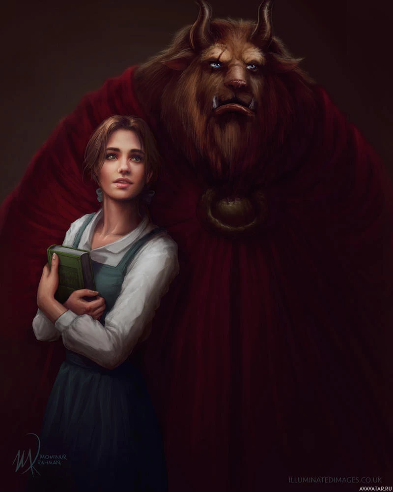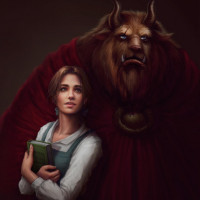 mythical creature. The girl is holding a book, suggesting a theme of storytelling or literature. The setting seems to be indoors, possibly in a room lit by candlelight. The characters are looking at each other, and the overall atmosphere suggests a moment of interaction between them, possibly during