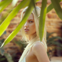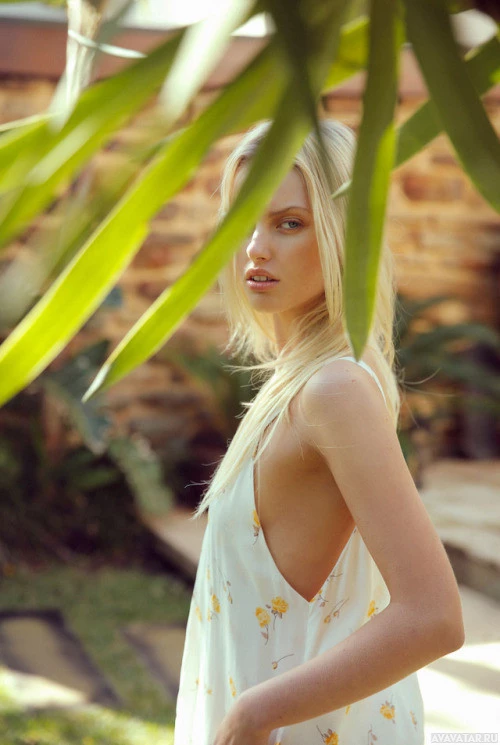 На снимке изображена женщина, стоящая снаружи. У нее длинные светлые волосы и она носит без рукавов верх с цветочными узорами. Она расположена перед некоторыми листовыми растениями, которые, по-видимому, являются частью наружной обстановки, возможно, сада или двора.