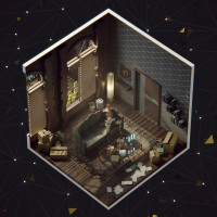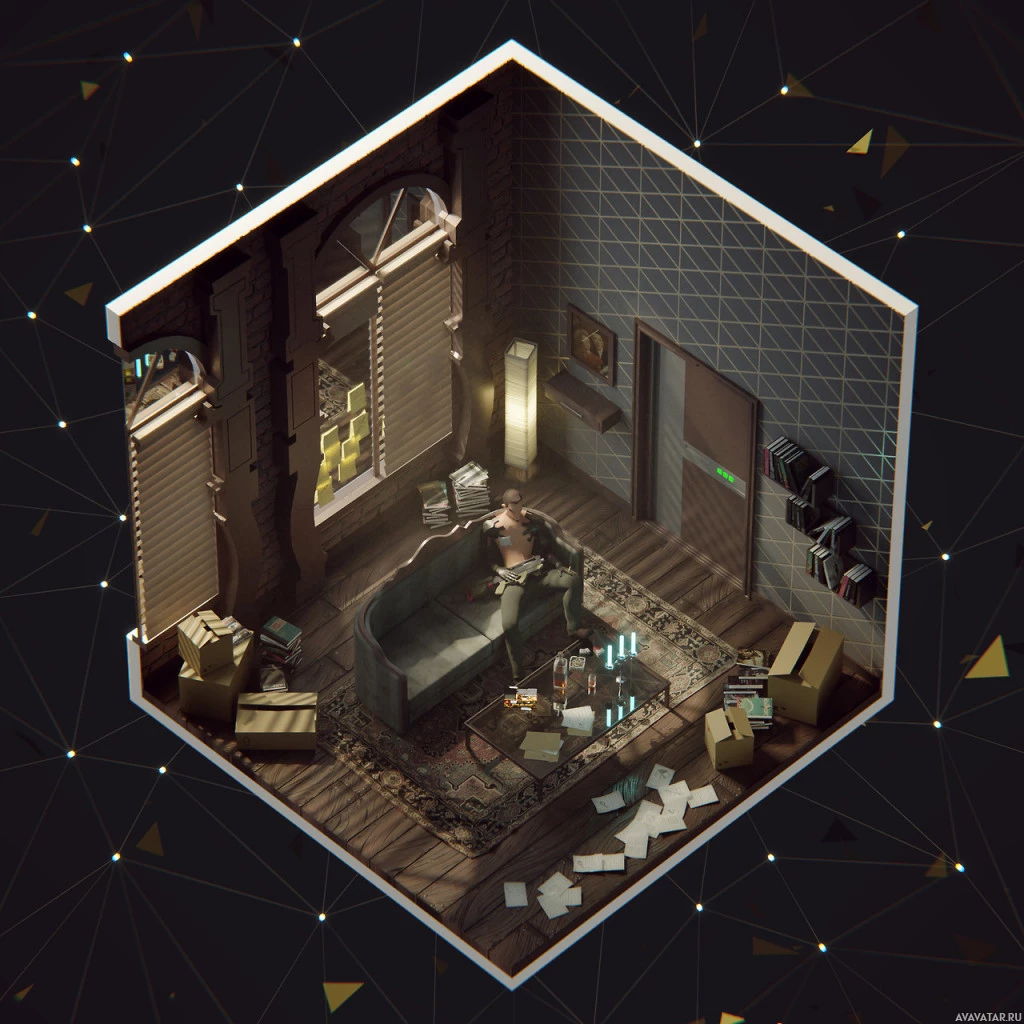 various objects such as boxes, papers, and other items scattered around. The room has a worn and aged appearance, with a window and a door visible in the background. There are also digital displays and interfaces visible on screens within the room, indicating that this is likely set in a futuristic or advanced environment where technology plays