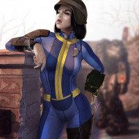 a female character depicted in the style of the Fallout game series. She has