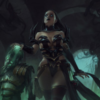 a fantasy setting. On the left, there is a figure that appears to be a humanoid robot with armor and a sword, while on the right, there is