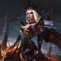 white hair, wears a dark armor with spikes and wings, and is riding a demonic creature that resembles a dragon. The character is styled as