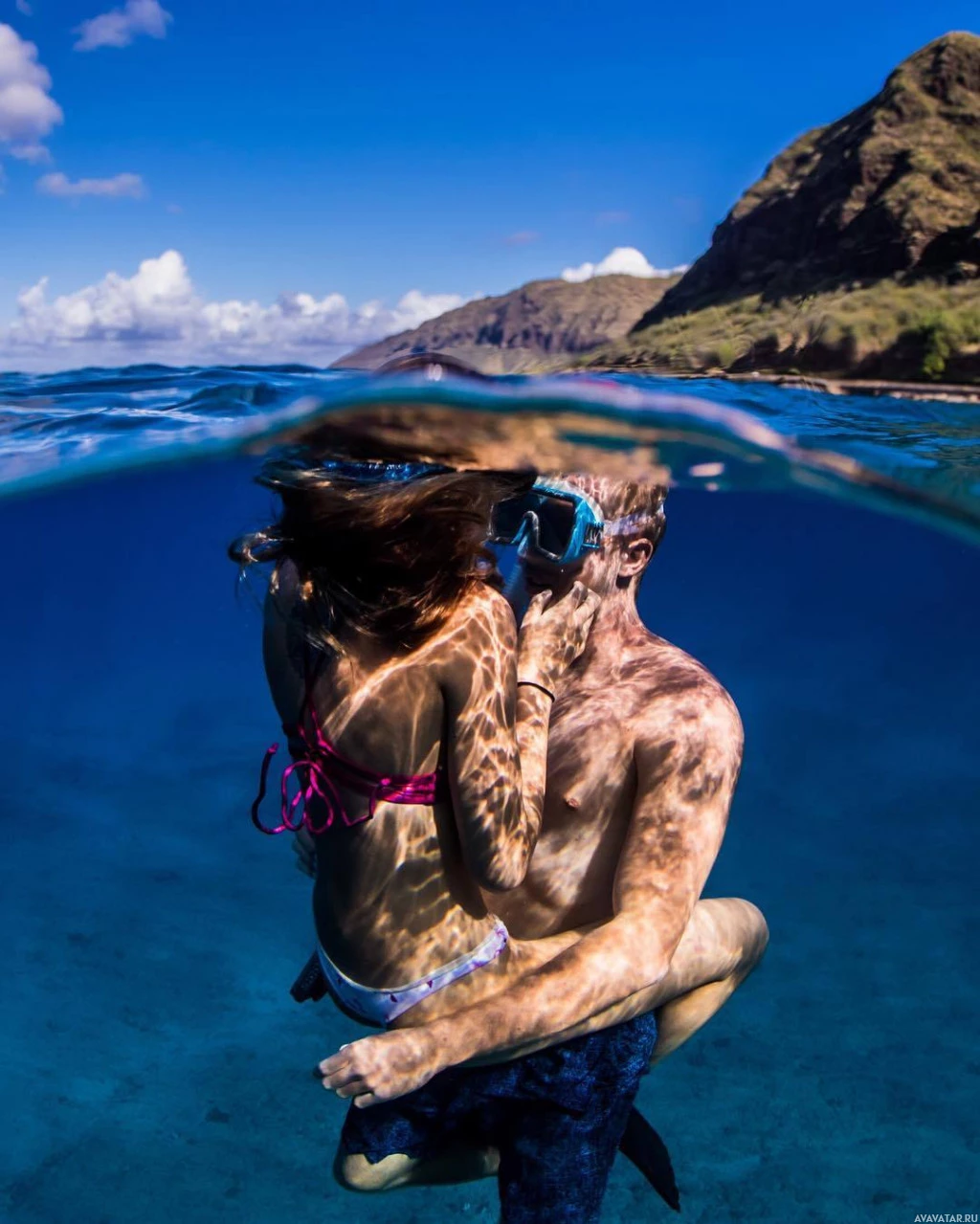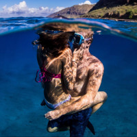 This is a photograph of two people underwater. They appear to be snorkeling or scuba diving, as they are holding onto each other and their heads are above