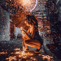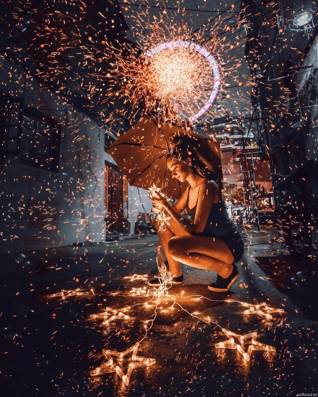 a young woman sitting on the ground under what appears to be a shower of sparkling lights, which gives the impression that she is surrounded by falling stars or some form of magical sparks. She's holding an umbrella over her head as if it were raining or snowing sparkles. The lighting suggests it might be nighttime, and there are hints of