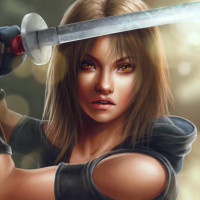 На картинке изображена женщина, держащая меч обеими руками, уравновешенная, как будто она готова к бою или сражению. Она, кажется, в бронированном наряде и ее волосы связаны назад. Обстановка, кажется, слабо освещена, предполагая либо среду с низким освещением, либо сцену, предназначенную для передачи интенсивности или действия.