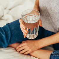 The image depicts a person sitting on the edge of a bed, holding a glass of water. They appear to be enjoying some leisure time indoors, possibly taking a break or relaxing. There is no visible wolf in this picture.