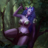 a dynamic pose, either climbing up or down a tree. She has long purple hair and is wearing a skin-tight outfit with intricate patterns on it, resembling traditional fantasy armor but made for